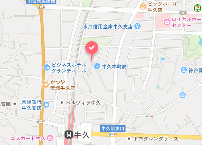 牛久駅から徒歩5分牛久駅東口をでてロータリーを左に回り、一つ目を左折、そのまま直進し横断歩道を渡り、椎名産婦人科の前を進み、突きあたりを右折し右側に本町郵便局が出てきたら向かいのアパートの101になります。